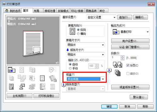 如果选择了[明信片],[纸张类型]会自动设为[厚纸 3]。如果选择了[信封],[纸张类型]会自动设为[信封]。