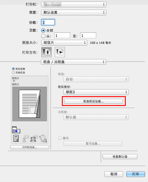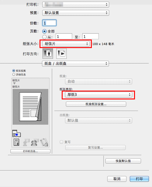 如果选择了明信片,[纸张类型:]会自动设为[厚纸3]。如果选择了[信封],[纸张类型:]会自动设为[信封]。