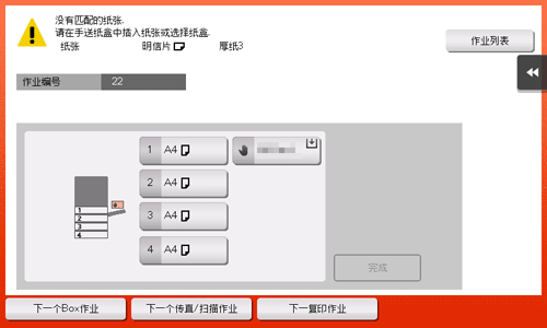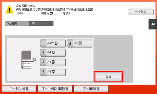 如果无法触摸[完成],确认打印机驱动程序的纸张设置是否符合主机的设置。另外,取出在手送托盘中所装入的信封或明信片,然后重新装入。