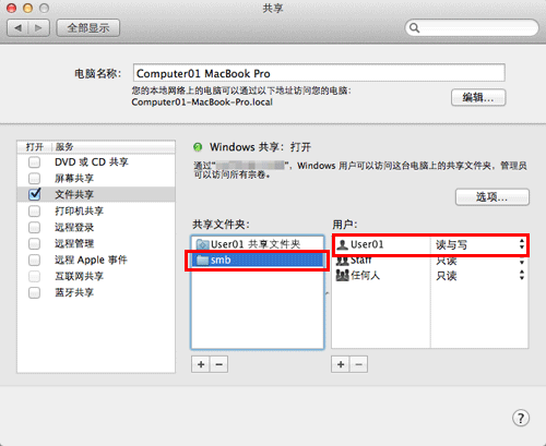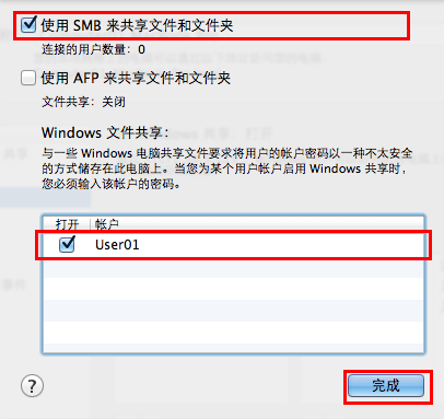 单击[选项],然后选择[使用SMB夹共享文件和文件夹]。然后,选择登录用户名(显示的名称)复选框。
