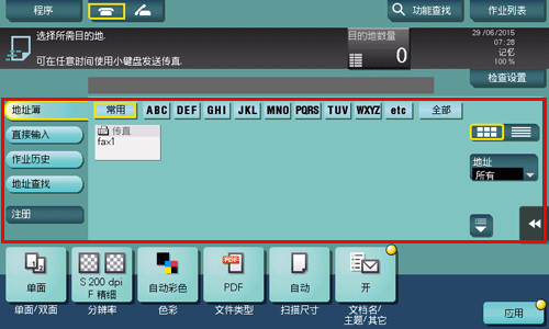 如有必要,可以更改传真/扫描模式中主屏幕的画面(默认值为[地址簿])。有关详细资料,请参见此处。