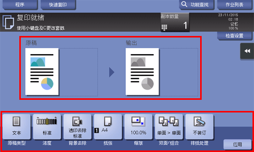 若要顺利配置各项复印设置,可以将基本的复印设置统一显示在一个屏幕上,然后在主屏幕中安排常用键。有关详细资料,请参见此处。