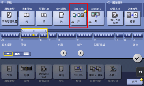 触摸[应用]-[原稿]-[分离扫描],然后设置为[开]。