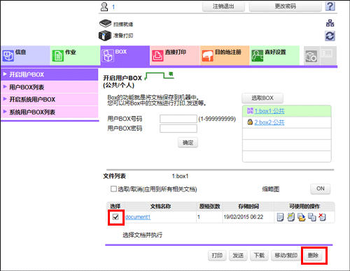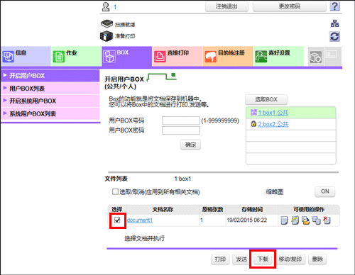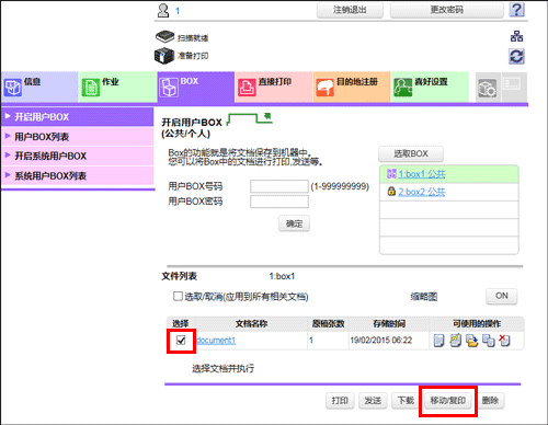 如果文件可以被移动或复制到其它用户Box,在[选择]列中将显示一个复选框。另外,在[可使用的操作]列中还会显示