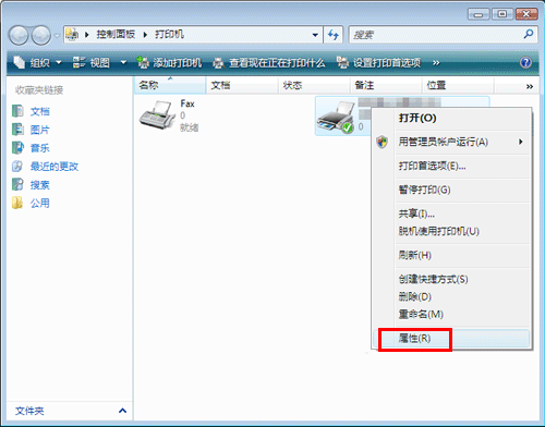在Windows Vista/Server 2008中,右键单击所安装打印机的图标,然后单击[属性]。
