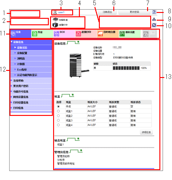 本示例显示[信息]-[设备信息]中的各个项目,以说明每个界面中的各部分。