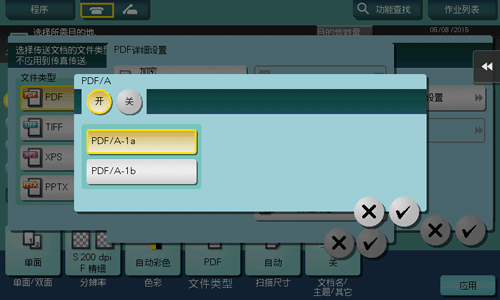 若要创建基于PDF/A的PDF文件,选择[PDF]或[紧凑型PDF]作为文件类型,触摸[PDF详细设置]-[PDF/A]。然后,配置以下设置。
