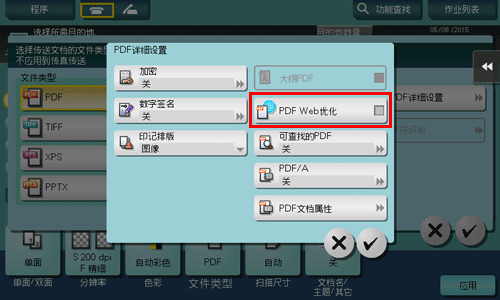 若要创建线性化PDF文件,选择[PDF]或[紧凑型PDF]作为文件类型,然后选择[PDF详细设置]-[PDF Web优化](默认值为[关闭](未确认))。
