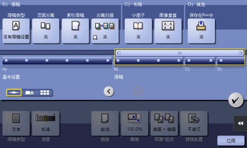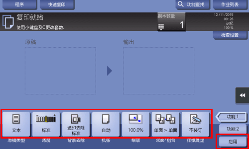 如果选择了[功能显示键(复印/打印)],您可以更改复印模式下主画面中显示的按键,以及用户Box模式下打印设置画面中显示的按键。