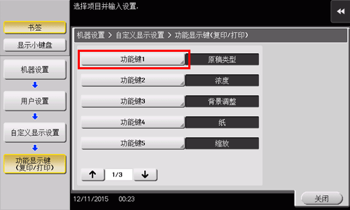 触摸[机器设置]-[用户设置]-[自定义显示设置],然后选择[功能显示键(复印/打印)]、[功能显示键(发送/保存)]或[功能键设置(发送传真)]。