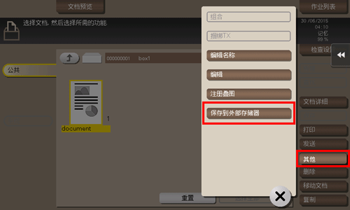 若要将文件保存至外部存储设备,选择要保存的文件,触摸[其他],然后触摸[保存到外部存储器]。