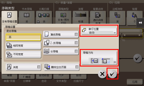 根据双面原稿设置[装订位置]和[原稿方向],然后触摸[