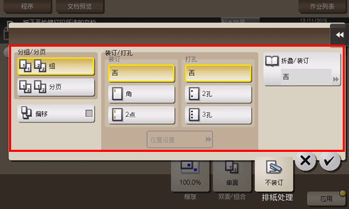 [位置设置] | 选择需要的装订或打孔位置。 指定[自动]时,装订和打孔的位置将根据原稿的装入方向自动设置。 | |