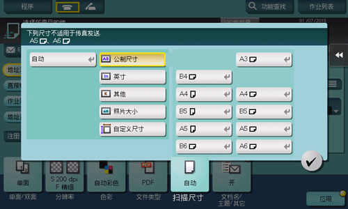 [公制尺寸] | 选择此选项可扫描公制尺寸原稿。触摸[公制尺寸],分别选择标准公制尺寸。 |