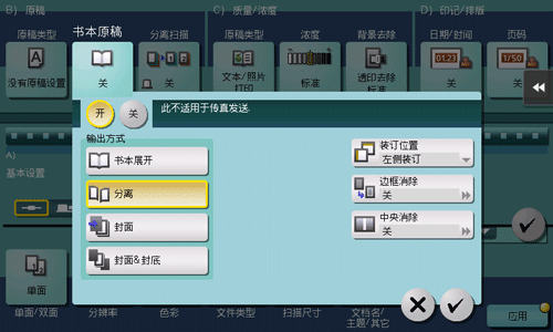 [装订位置] | 如果将[输出方式]选择为[分离]、[封面]或[封面&封底],请选择双页展开装订方向。 为左侧装订的两页展开原稿选择[左侧装订],为右侧装订的两页展开原稿选择[右侧装订]。 请注意,如果未正确指定装订位置,那么双页展开页的页面顺序会在左页和右页之间反转。 |