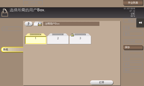 若要访问该用户Box中的文件,选择所需的用户Box,然后触摸[打开]。