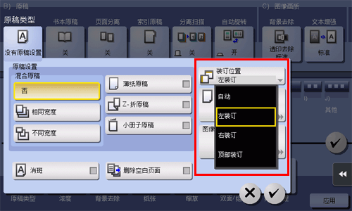 当扫描双面原稿时,选择原稿的装订位置,以防止正反面的装订位置颠倒。