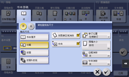 [非图像区域消除] | 如果选择书本原稿,则自动设置此项目。 当ADF打开且原稿放在稿台上进行复印时,机器将检测原稿的轮廓并消除原稿外的阴影。 必要时取消设置。 |