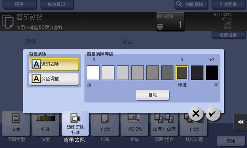 调整带有彩色背景的原稿的背景颜色浓度。如果选择了[自动],将自动确定背景颜色的浓度,且将原稿以最佳背景浓度等级复印。