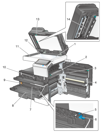 13 | 打开和关闭导板 | 该杆可将导板锁定以扫描原稿背面。清除卡纸或清洁狭长扫描玻璃(背面)时打开此导板。 |