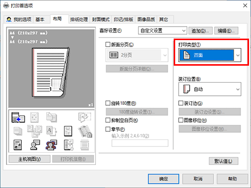 在[布局]选项的[打印类型]中选择[双面]。默认会指定[双面]。