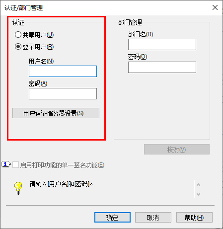 本机可供公共用户(未注册用户)访问时,选择[共享用户]时可让您无需输入用户名和密码即可执行打印。