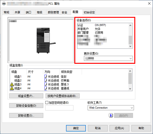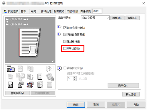 在打印机驱动程序的[配置]选项中,检查用户认证/账户跟踪设置是否配置正确。