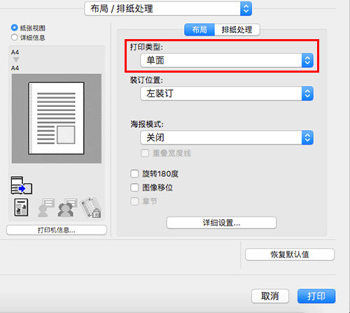 在[布局/排纸处理]的[打印类型:]中,选择[单面]。