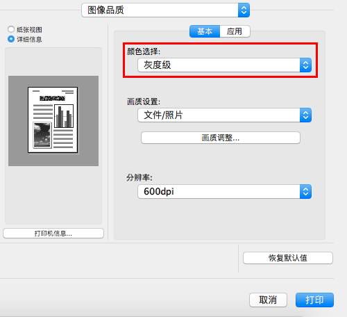 在[图像品质]的[颜色选择:]中,选择[灰度级]。
