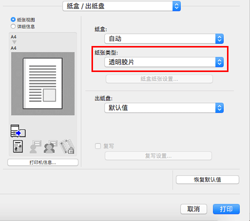 在[纸盒/出纸盘]的[纸张类型:]中,选择[OHP投影片]。