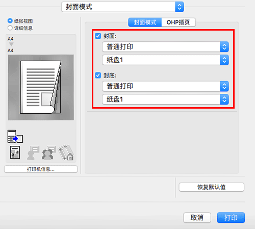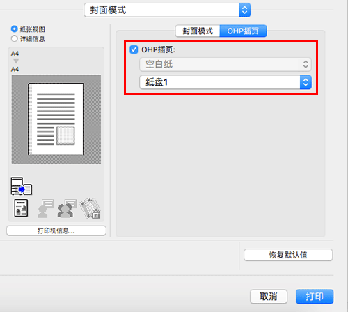 在[封面模式]中,选择[OHP插页:]复选框。