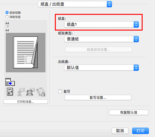 在[纸盒/出纸盘]的[纸盒:]中,选择用于打印正文页的纸盒。