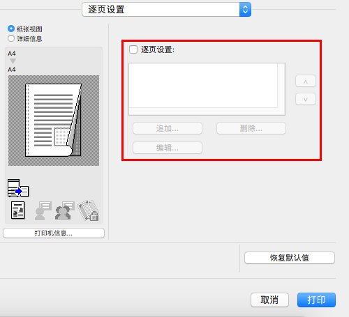 如果列表中未注册任何内容,选择[逐页设置:]复选框会自动显示设置窗口。