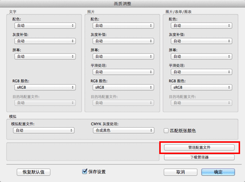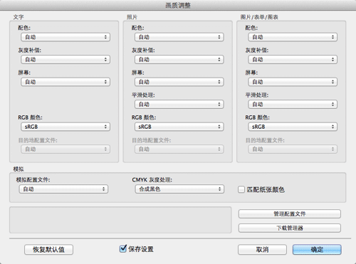指定[RGB 颜色:]、[目的地配置文件:]和[模拟配置文件:]的设置。