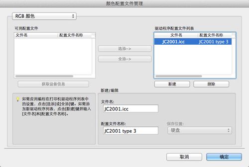 若要使用本机中注册的新ICC配置文件,需要事先将ICC配置文件添加到打印机驱动程序中。有关详细资料,请参见此处。
