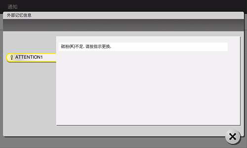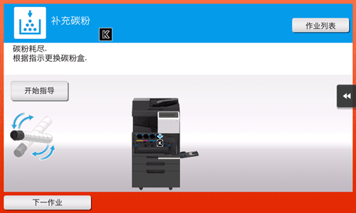 需要更换碳粉盒时,将显示一条更换提醒信息。根据维修合同进行更换。您可以在画面上触摸[开始指导]显示更换步骤并确认。
