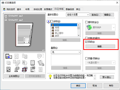 在[印记/排版]选项中,选择[页码]复选框,然后单击[编辑...]。