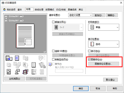 若要启用图像偏移,请选择[布局]选项上的[图像移位]复选框并单击[图像移位设置]。
