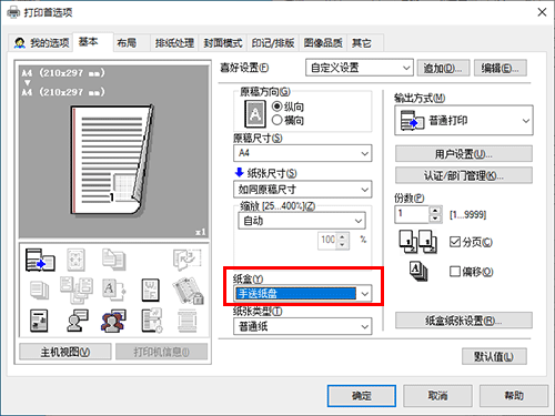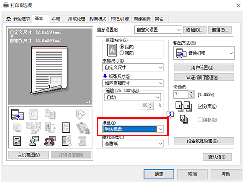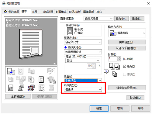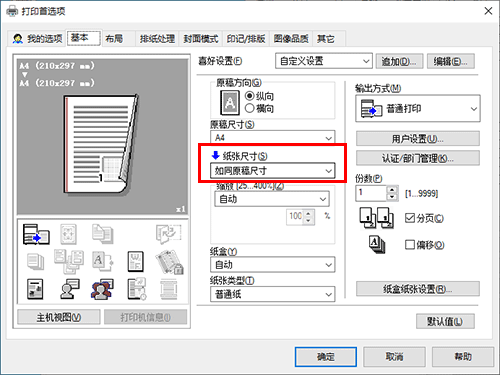 在[基本]选项的[纸张尺寸]中,请选择正确纸张尺寸。
