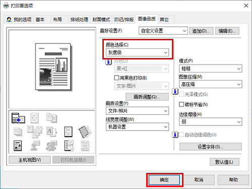 从[图像品质]选项中的[颜色选择]选择[灰度级],然后单击[确定]。