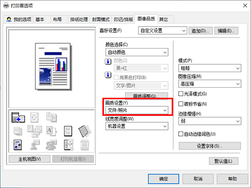 在[图像品质]选项的[颜色设置]中,选择要打印的文档类型。