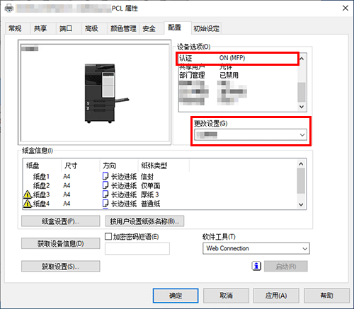 答案. 在打印机驱动程序的属性窗口,将用户认证更改为正确的设置。