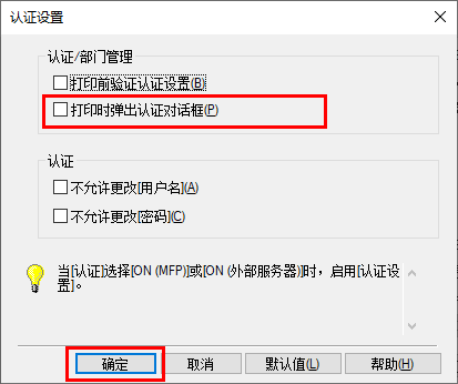 在[认证/部门管理]中,选择[打印时弹出认证对话框]复选框,然后单击[确定]。