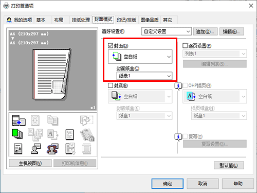 若要使用其它类型的纸张打印封页,在[封面模式]选项上选中[封面]复选框。