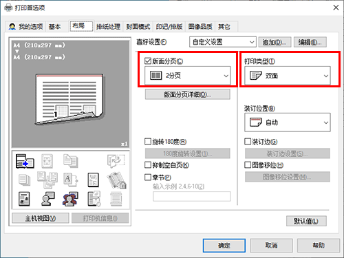 若要将多页原稿打印到一页的相同面上,请选择[布局]选项上的[版面分页]复选框以选择页面组合格式。若要在纸张双面上打印,请从[布局]选项的[打印类型]上选择[双面]。