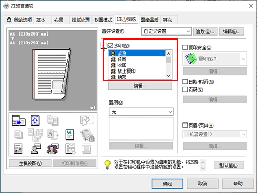在[印记/排版]选项中,选择[水印]复选框,然后选择水印。
