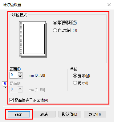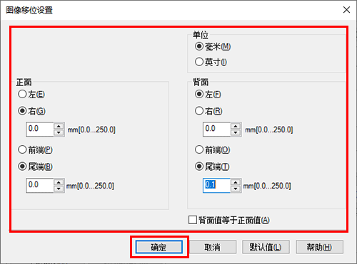 [正面]/[背面] | 设置偏移打印位置的方向和数值。对于双面打印,选择[背面值等于正面值]复选框将允许您为正反面指定相同的值。 |