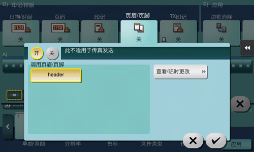 在指定页的顶部和底部页边距(页眉/页脚)添加日期、时间和所需文字。但必须事先在本机上注册要添加到页眉和页脚的信息。