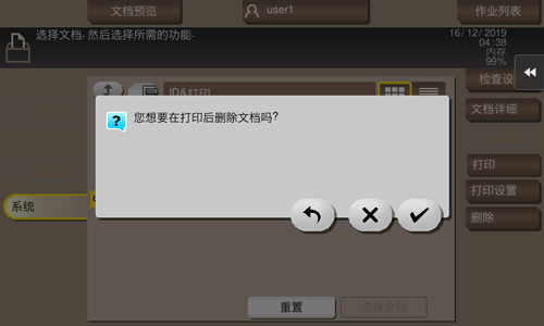 从用户Box中打印文件。选择在文件打印后是将文件保留在用户Box中还是将其从用户Box中删除。