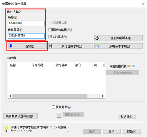 输入目的地的名称和传真号码,然后单击[增加]。